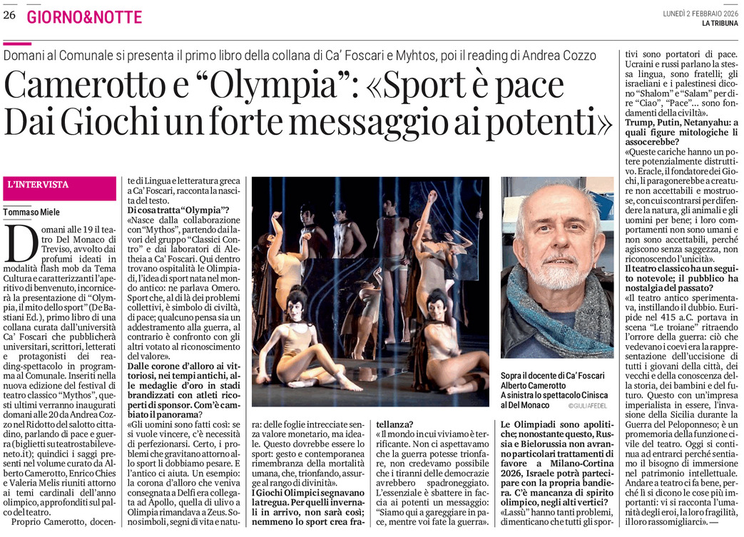 Domani 3/02 alle 19, il teatro Del Monaco di Treviso ospiterà la presentazione di “Olympia, il mito dello sport” (De Bastiani Ed.), primo libro di una collana curata dall’università Ca’ Foscari, dal gruppo di ricerca universitario “Aletheia” e dall’associazione culturale cafoscarina “Classici Contro“. Co-curatore di quest’ultima, il Prof. Alberto Camerotto, membro del consiglio scientifico di Fondazione Ve.Ri.Pa., viene qui intervistato dal giornalista Tommaso Miele. ... Vedi altroVedi meno